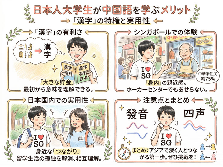 実際、シンガポールに英語の語学留学やワーホリに来る大学生の中には第二外国語で中国語を選択した方が多く、外国語学部で中国語を専攻している方もいらっしゃいます。