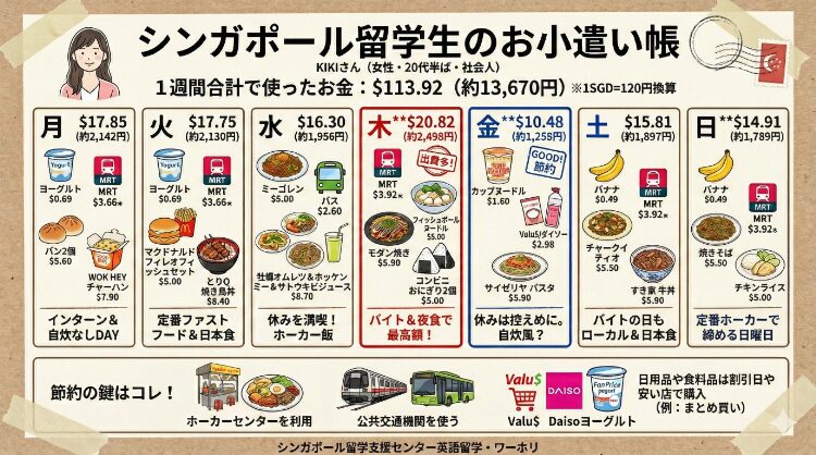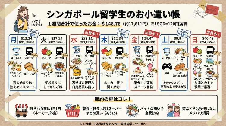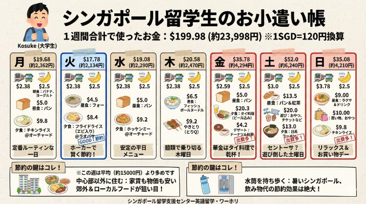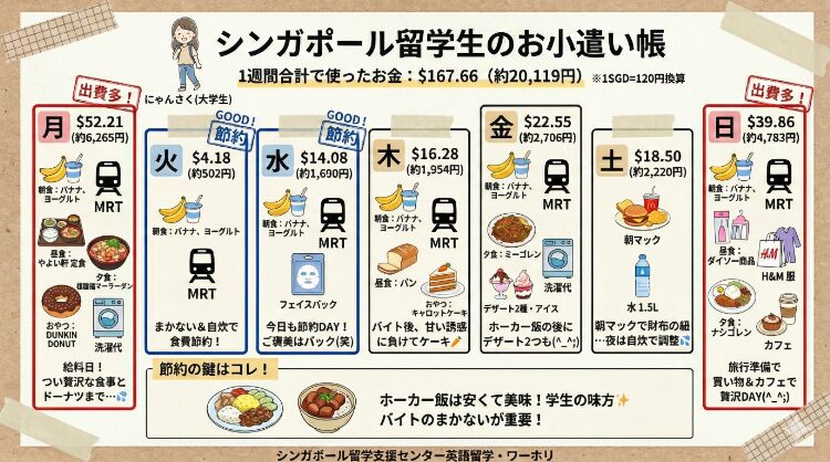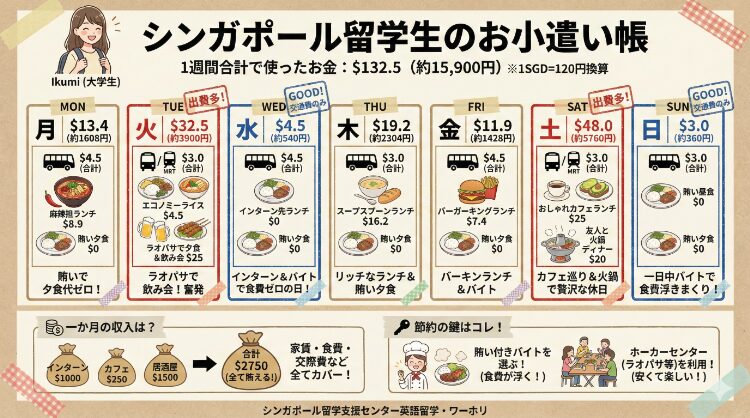 「ワーホリブログ」では「留学生のお小遣い帳」と題してシンガポールで英語留学・ワーホリを経験した皆さんの1週間の生活費を公開しています。大学生や20代半ばくらいの皆さんです。